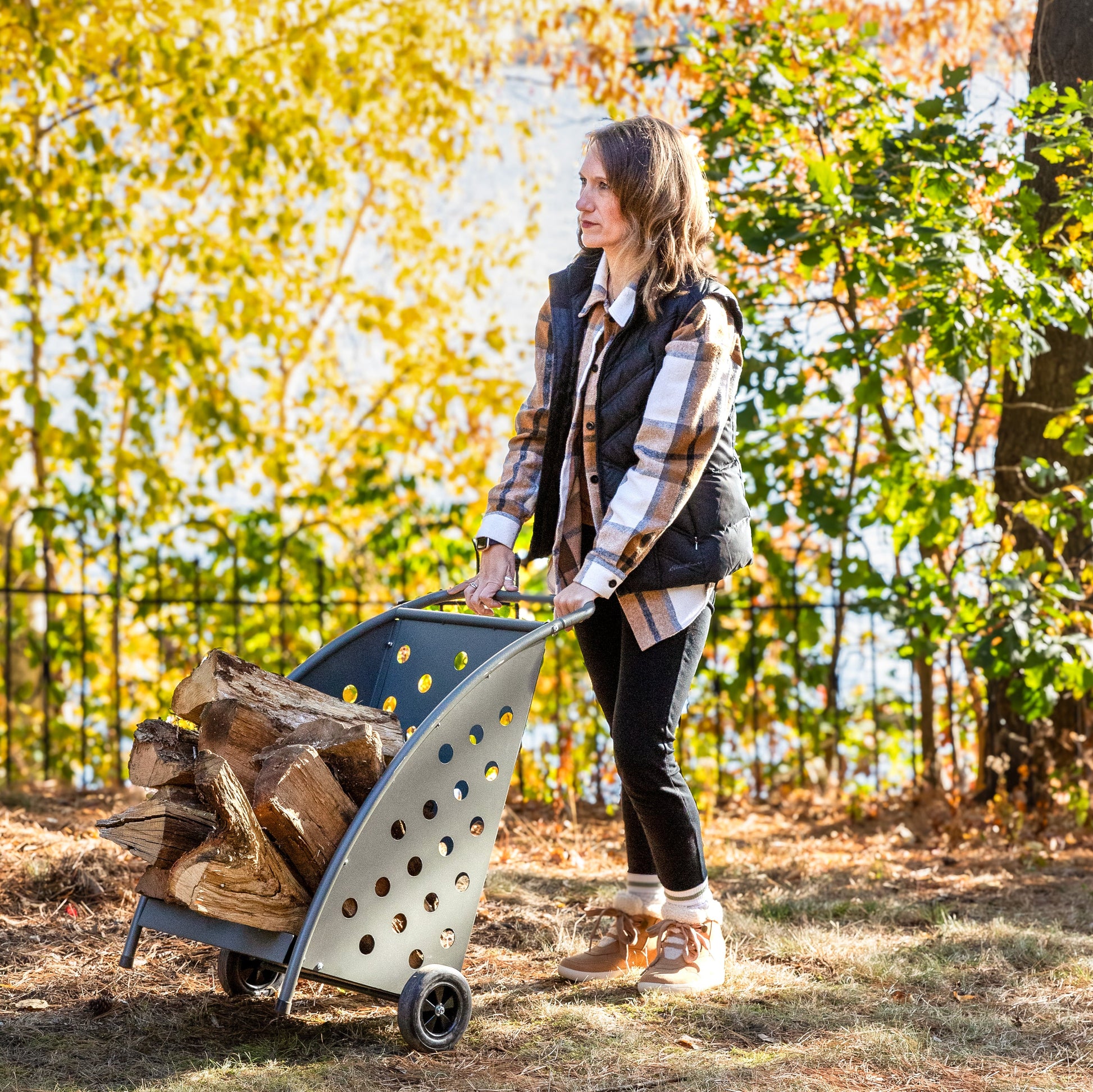 Easily keep your firewood neatly stacked and ready to burn with this convenient firewood cart. Made from durable steel with a classic gray, powder-coated finish, this firewood cart is built to provide season after season of strength and style. The log cart features a rugged design that is capable of supporting up to 110 lbs. The handle and back wheels make it easy to transport the cart from place to place. Designed for indoor or outdoor use, add this firewood cart to the living room for easy firewood access or next to the fire pit in the backyard to keep bonfires burning.