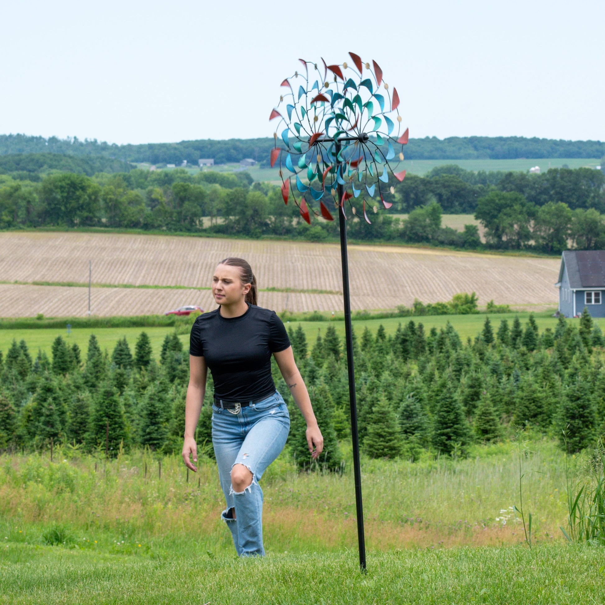 Add a touch of beauty to the yard or garden with this elegant multicolored kinetic wind spinner. Featuring two unique blades that are capable of spinning both clockwise and counterclockwise based on the wind direction, this garden decor art piece features striking shades of red, blue, yellow, and turquoise. Plus, the top portion of the wind spinner can swivel 360 degrees. The yard wind spinner features a 4-point step-in stake to ensure that it will remain securely upright.