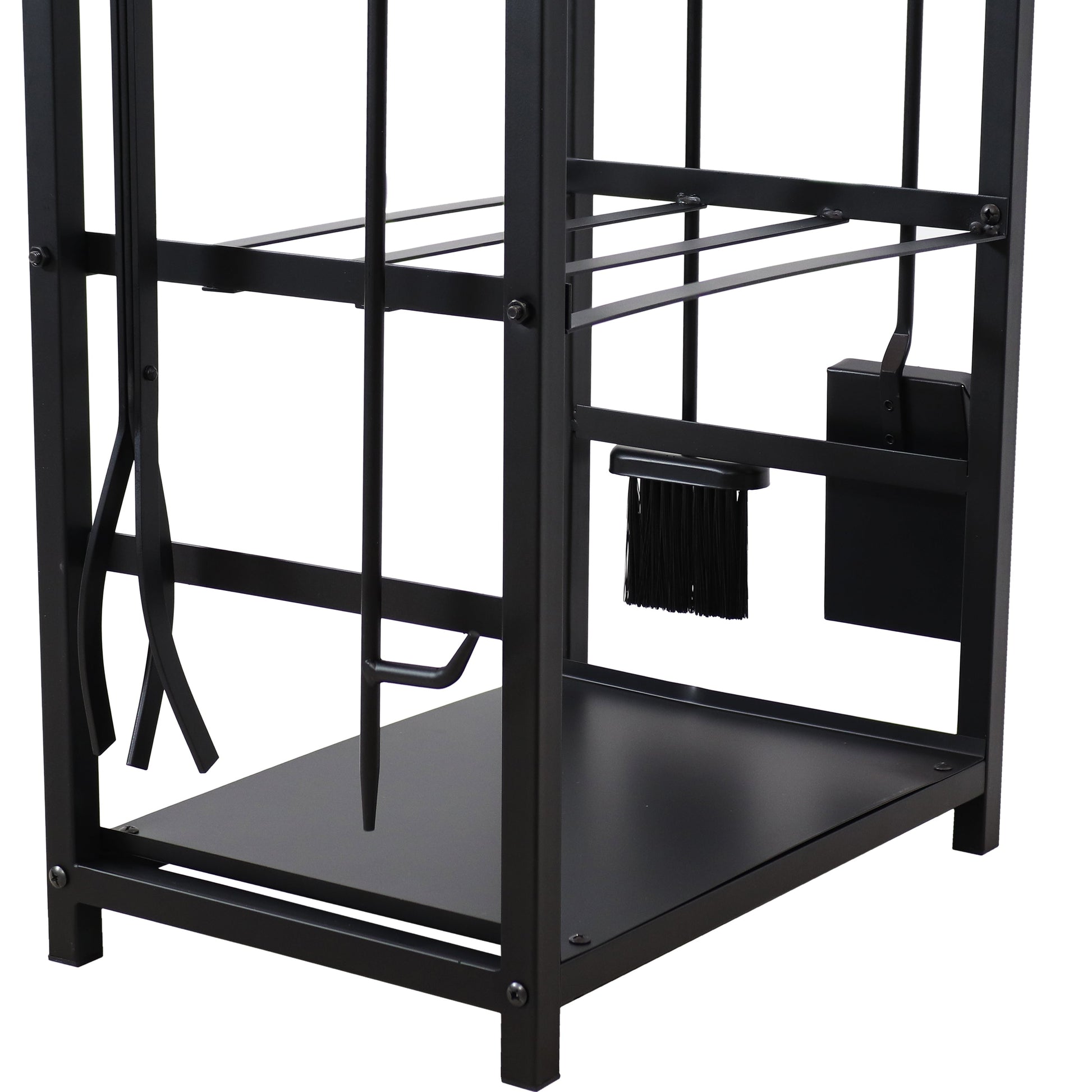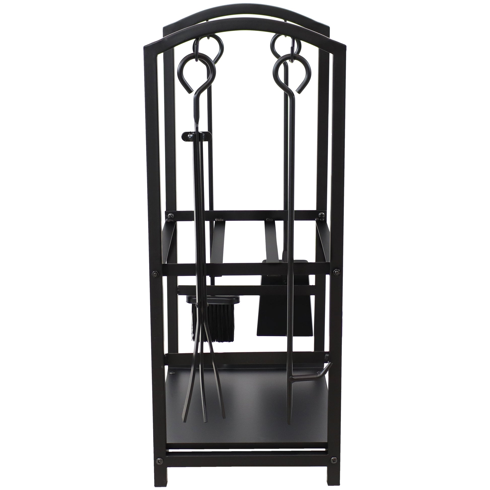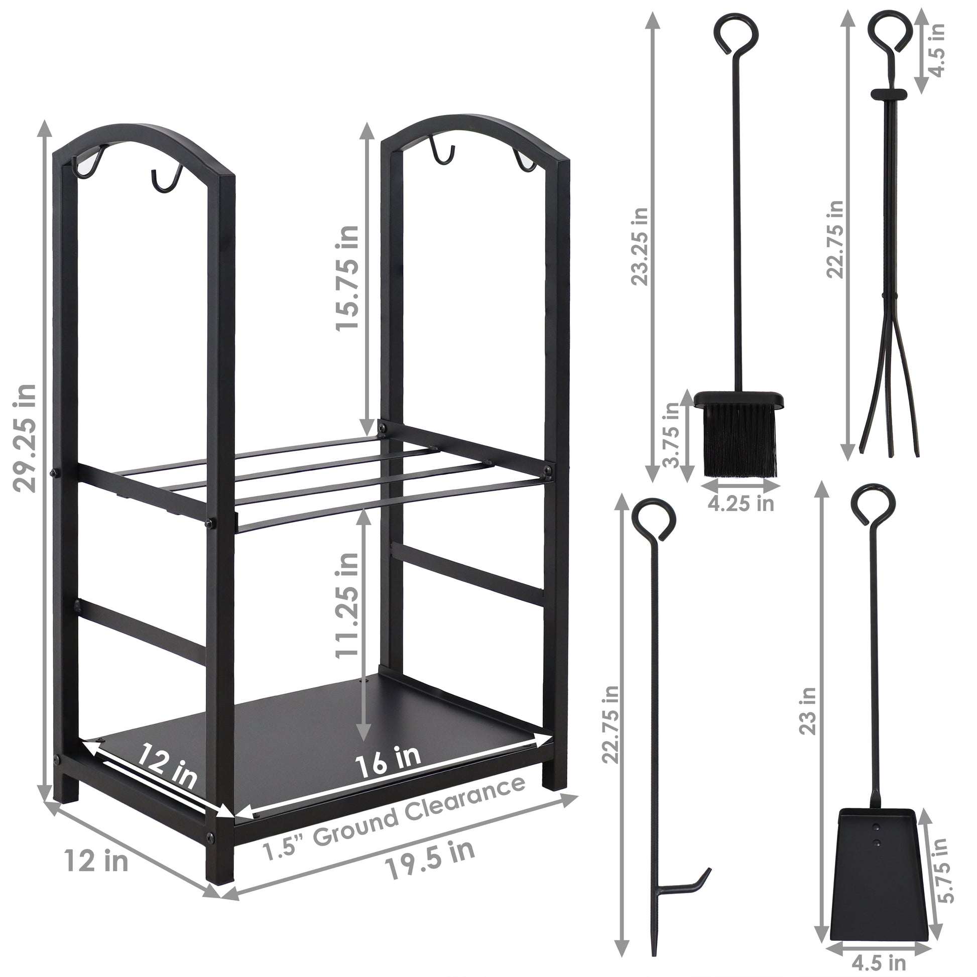 Bring charm to your hearth with this classic firewood holder with tools. This 5-piece set includes 1 poker, 1 shovel, 1 brush, 1 log tongs and 1 log holder. The fireplace tool set with log holder features black powder-coated steel construction and has hooks for the 4 included tools that feature round handles to make them easier to hang on the log holder.