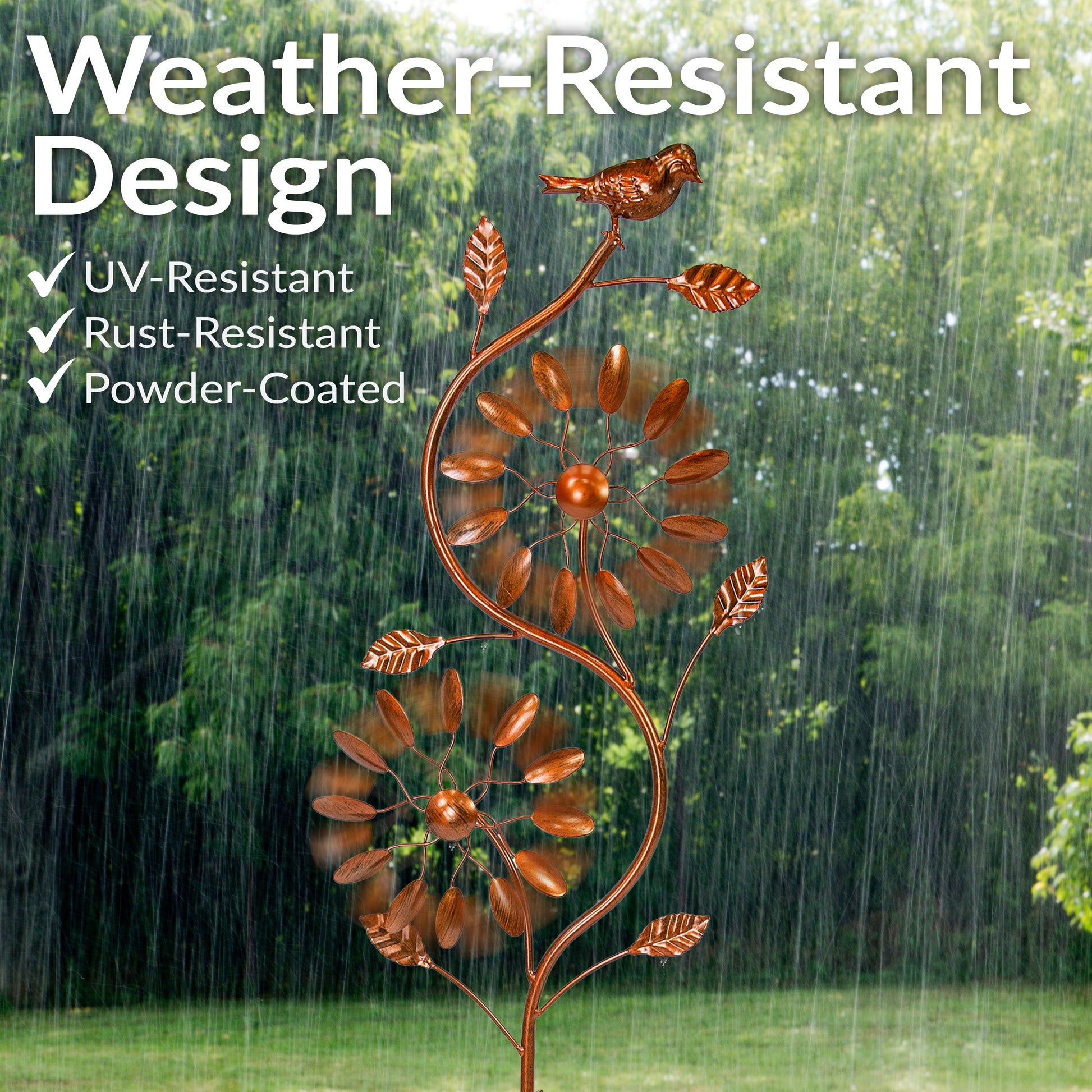 Add charm and movement to any garden with this elegant, staked, iron yard wind spinner. Featuring a durable copper powder-coated finish, it resists rust and maintains a timeless shine. Two rotating sections with an intricate petal design create a mesmerizing display in the breeze independently rotating clockwise or counter-clockwise, while a decorative bird adds a whimsical touch. Secured by a sturdy two-prong ground stake, it stays stable even in windy conditions. Ideal for gardens, patios, or walkways, this kinetic wind spinner enhances outdoor spaces with dynamic movement and artistic charm, blending functionality with beauty in nature-inspired settings.